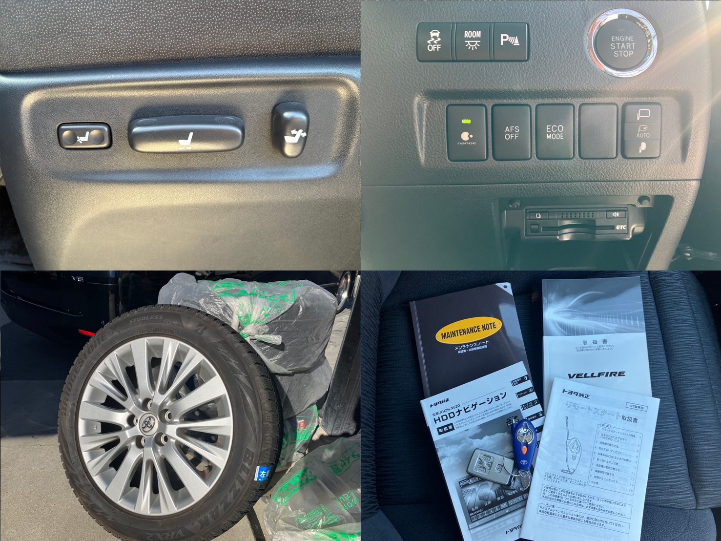 純正8インチHDDナビ(CD・DVD・フルセグTV・Bluetoothオーディオ・SD・ミュージックサーバー) バック&フロントカメラ 両側パワースライドドア パワーバックドア ビルトインETC プッシュスタート&スマートキー 障害物センサー エグゼクティブシート 2列目・助手席オートオットマン 1列目・2列目パワーシート 運転席メモリーシート ウッドコンビ&革巻きステアリング ステアリングスイッチ クルーズコントロール デュアルエアコン Wエアコン 純正リモコンエンジンスターター AUTOミラー AUTOライト TRD製フロントスポイラー HIDヘッドライト フォグランプ ウインカーミラー 社外19インチAW メンテナンスノート&取説 ★純正18インチAW付きスタッドレスタイヤ4本お付けします