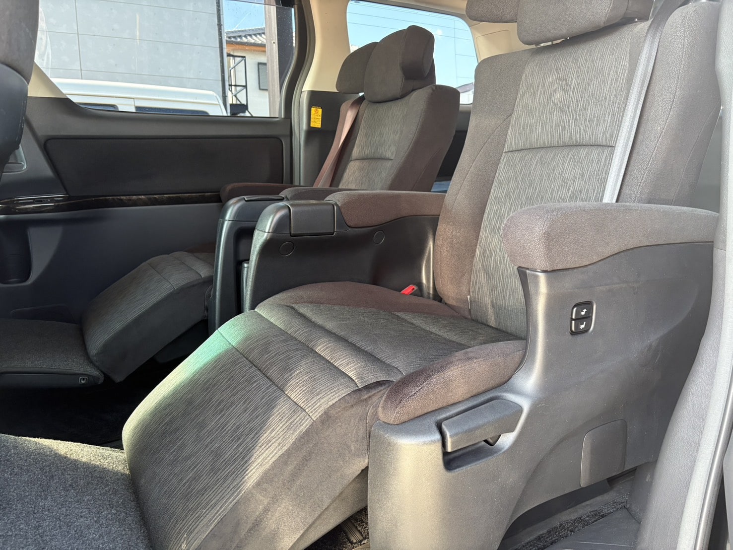 7人乗りエグゼクティブシートの豪華な1台✨ TRD製フロントスポイラーや社外19インチAWで外装もインパクト抜群⚡ 8インチサイズのナビでBluetoothオーディオ接続可能📱 バック&フロントカメラ搭載で駐停車も安心👌 とにかく内装が豪華でVIP空間となっています‼️ 《1年保証付》