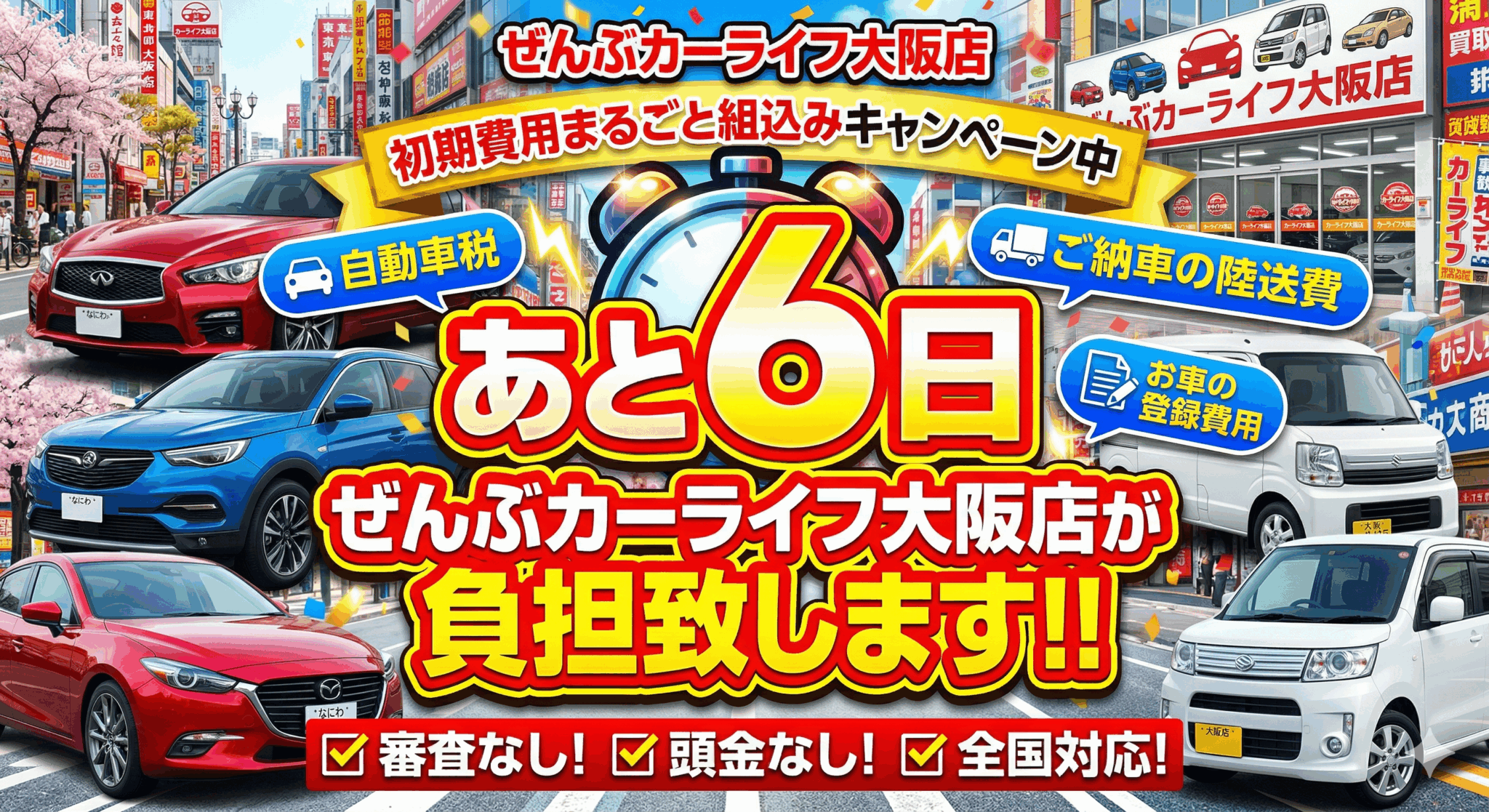 「車は欲しいけど、まとまった初期費用が心配…」そんな方は、カーライフ大阪店にお任せください!現在、以下の諸経費をすべてプランにまるごと組み込める特別キャンペーンを実施中! 自動車税 ご納車の陸送費 お車の登録費用さらに… 審査なし! 頭金なし! 全国対応!キャンペーン終了まであと6日。「今の状況で買えるかな?」と不安な方も、まずは一度ご相談ください! お問い合わせ:072-290-7729
