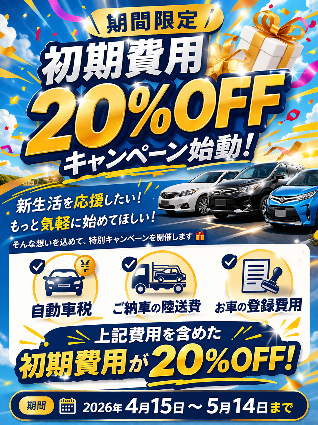 🌸 春のドライブ応援!全車両「初期費用20%OFF」